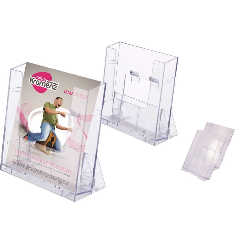 Akrylowy pojemnik na ulotki wielkości A6 wykonany z wysokiej jakości plastiku. Dostępny format A5.