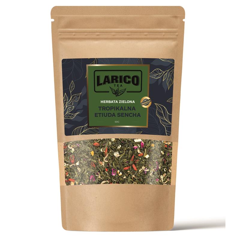 LARICO HERBATA ZIELONA TROPIKALNA ETIUDA SENCHA to zielona herbata typu sencha z płatkami róży, jaśminem, skórką pomarańczy i owocami żurawiny. Kolorowa kompozycja z wiórkami kokosowymi, owocami goji i owocowym aromacie zachęca do jej spróbowania.